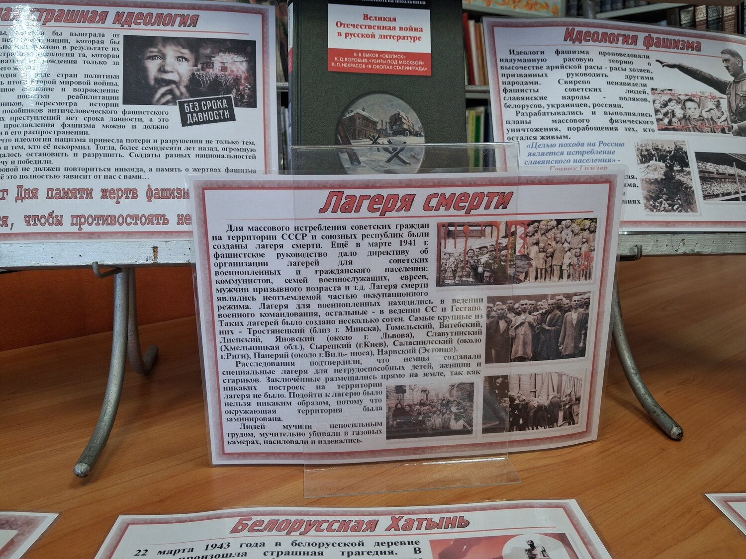 12 сентября в модельной библиотеке - филиале №3, к Международному дню памяти жертв фашизма, прошел Час памяти "Чтобы помнили...". Ребята узнали об истории возникновения этой даты, о десятках миллионов людей погибших в концлагерях. К этому событию была подготовлена выставка "День памяти жертв фашизма", она познакомила с трагическими событиями прошлого, мемуарами участников войны, исследованиями о геноциде и преступлениях против человечности, а также художественными произведениями, отражающими ужасы войны и героизм людей.